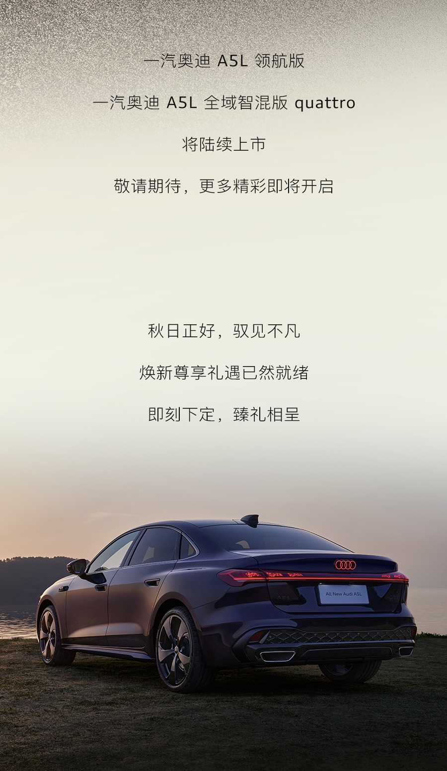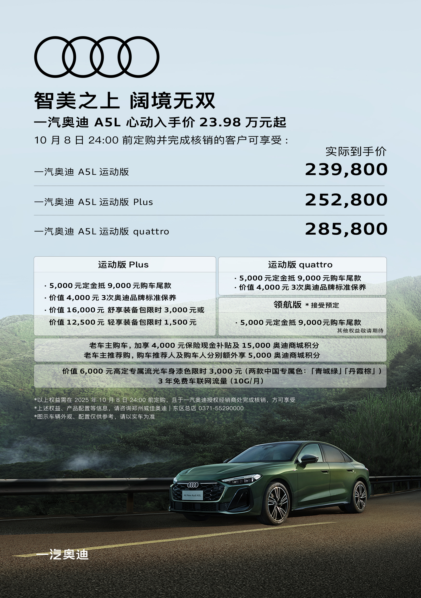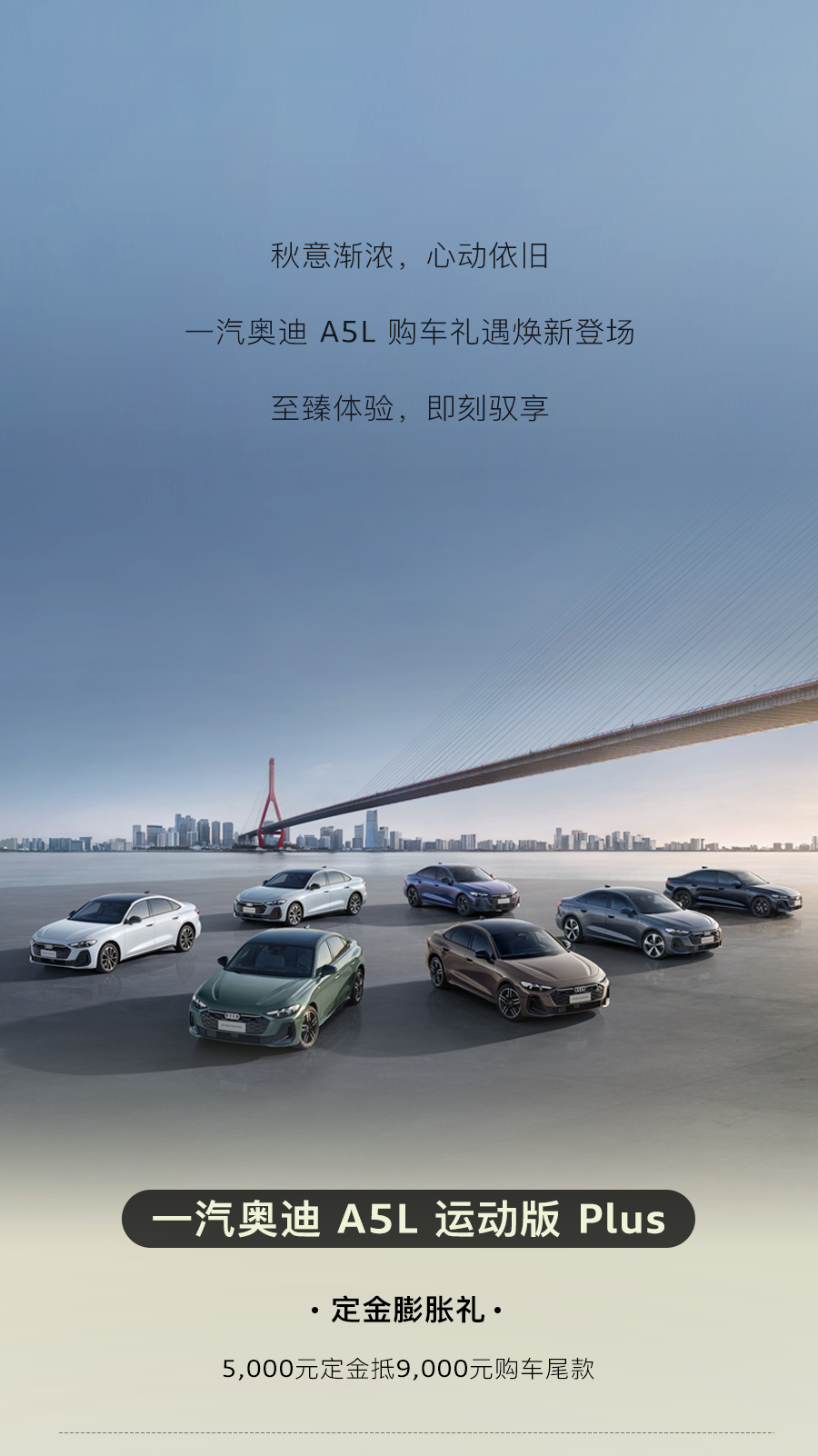 智美之上 闊境無雙全新一汽奧迪A5L 心動上市誠意價到:23.98萬起 開啟豪華新篇章更可享受 「HIGH 5」上市五重禮限時權益等您鎖定詳情咨詢一汽奧迪河南威佳