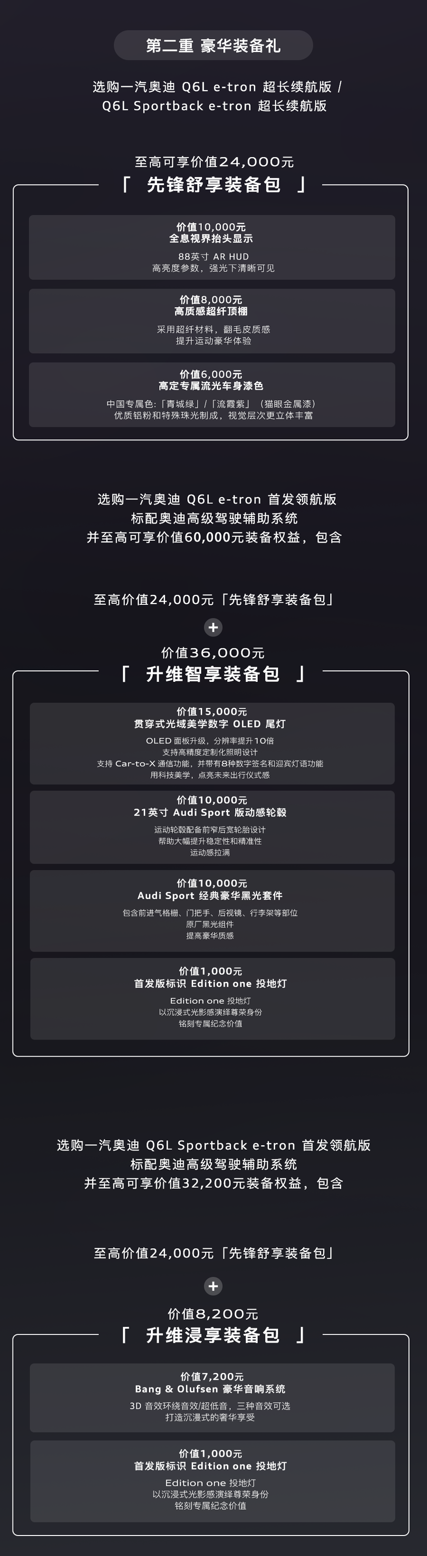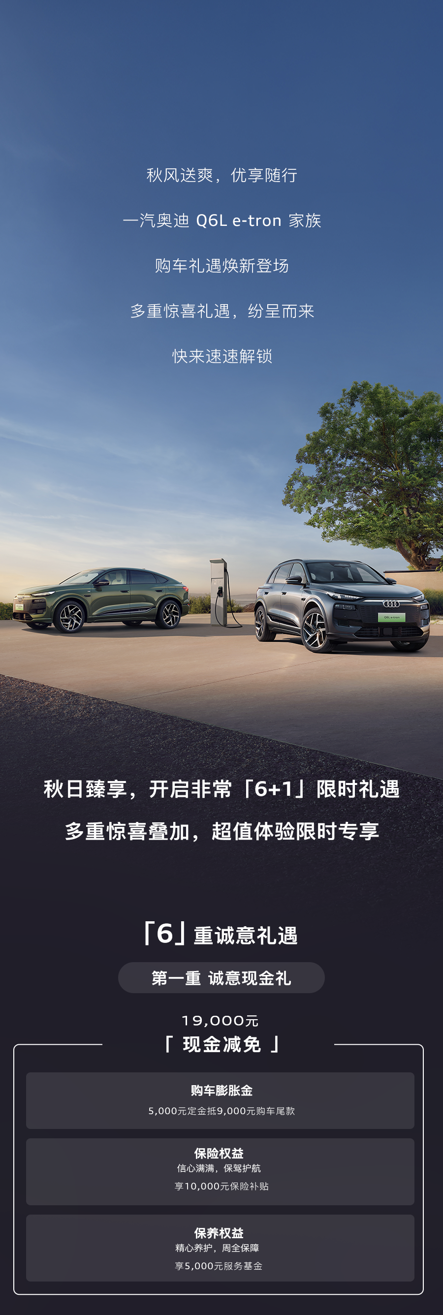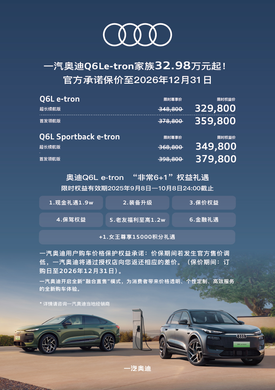 百年奧迪 王者歸來一汽奧迪 Q6Le-tron 家族 32.98 萬元起豪華智能電動旗艦 SUV 誠意上市限時尊享非常6+1超值權益詳情咨詢一汽奧迪河南威佳
